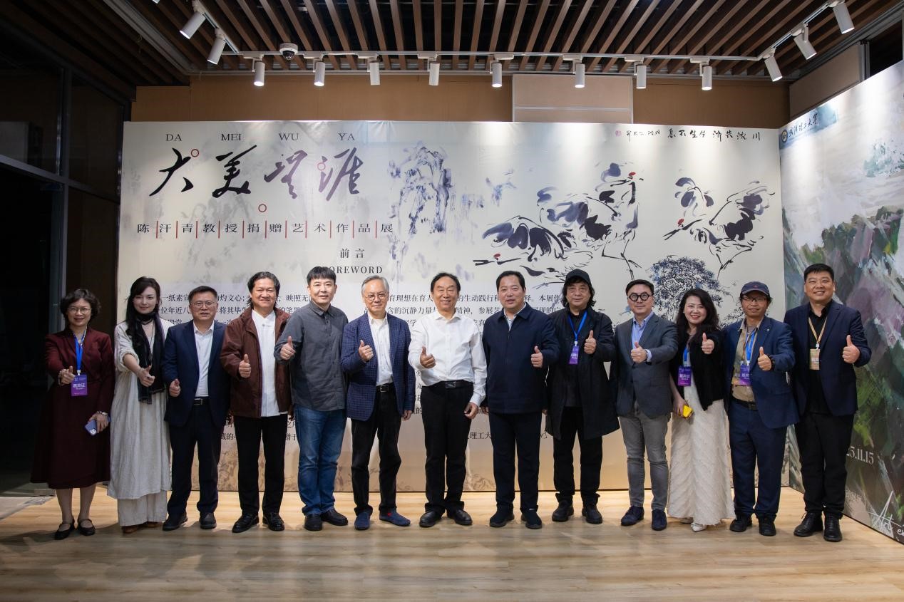 一纸素宣,承载千钧文心;数点墨痕,映照浩瀚艺境。11月1日,“大美无涯——陈汗青教授捐赠艺术作品展”在武汉理工大学艺术馆流动展厅启幕。展览由武汉理工大学艺术馆、艺术与设计学院联合主办。武汉理工大学党委书记孟芳兵,上海工程技术大学校长娄永琪、景德镇陶瓷大学原校长宁钢、清华大学艺术博物馆馆长鲁晓波等众多艺术界名家,以及校内外嘉宾、师生代表共同见证了这一“化私为公、向美而行”的文化盛典。