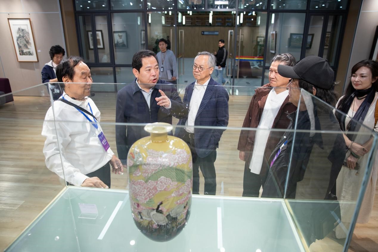 展厅内书画与陶瓷交相辉映,陈汗青教授向来宾们一一介绍了本次展出的捐赠藏品,宁钢教授创作的国礼瓷《祥云》龙纹瓶成为本次展览的焦点之一。宁钢教授亲自向孟芳兵书记等来宾介绍了其创作经历。据宁钢教授介绍,2013年,本次展出的《祥云》龙纹瓶作品随“景德镇现代陶瓷艺术展”走进英国剑桥大学,与《岁岁和合》瓷盘一起被白金汉宫永久收藏,成为迄今仅有的两件获此殊荣的现代中国陶瓷作品。此次在陈汗青教授的大力推动下,宁钢教授将这件再次创作的具有重要国际影响力的珍贵作品回赠母校,生动诠释了艺术接续传承的无疆大爱。孟芳兵书记代表学校党委向所有慷慨捐赠的艺术家们致以诚挚谢意。