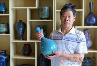 卢俊岭,河南省陶瓷艺术大师、河南省非物质文化遗产代表性传承人,卢钧第五代传人,生于1954 年。卢俊岭创烧的“黑唐新花”,成为卢家新的独门绝技。“黑唐新花”窑变效果以黑、白、蓝为主要色调,表现特征为黑中泛蓝、蓝中隐白、蓝白相间,有时还有红色浸润其间,在主色调上呈现大量的蚯蚓走泥、龟背等纹路,既似唐时风采,又藏宋时韵味