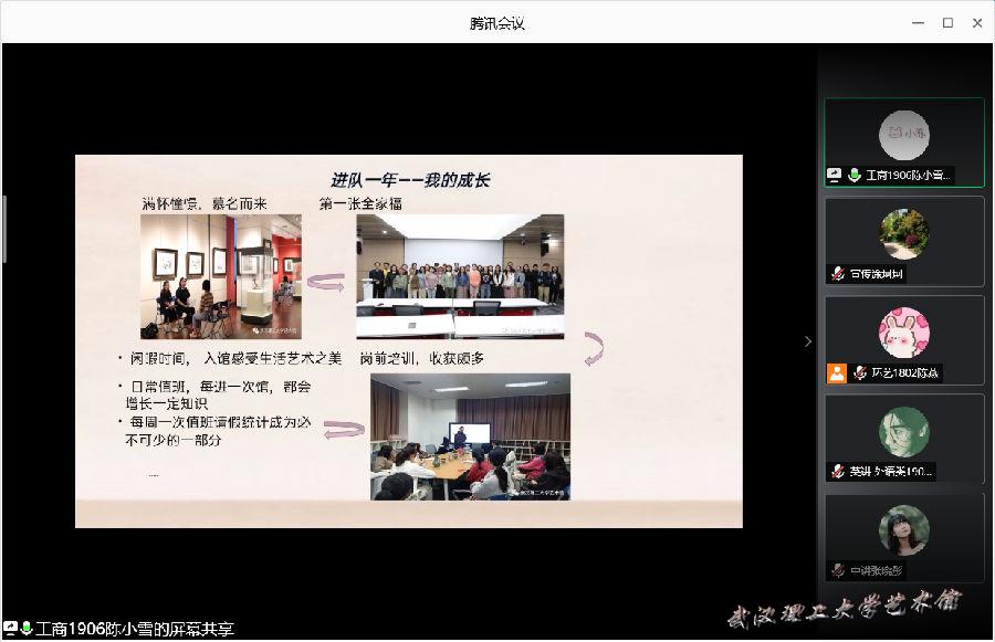突如其来的新冠肺炎阻挡了我们返校的步伐,很多的学习与活动都改变了形式,选择在线上进行。在这个特殊的时期,武汉理工大学艺术馆服务队于7月10日晚通过线上会议的方式进行了2020年度换届大会。