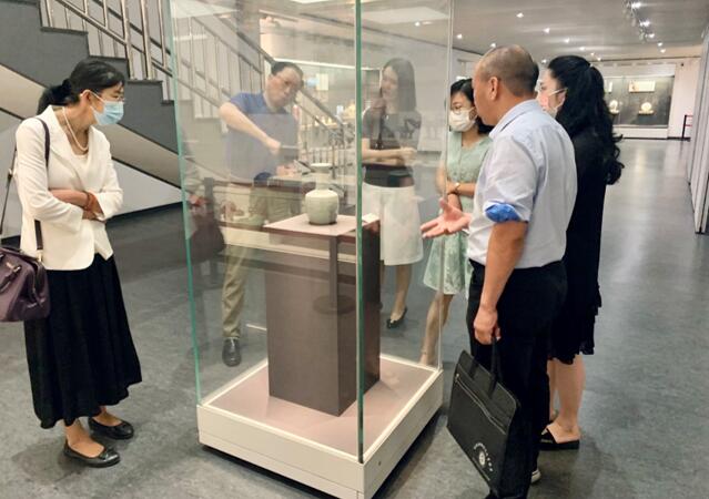 高维义书记从高校博物馆的特征、作用和育人优势出发,介绍了我馆的基本情况以及在营造校园文化氛围和文化育人方面所发挥的积极作用,并结合展厅设计和具体藏品进行了讲解。在书画展厅,来宾们钟情于方楚雄教授的《山梅飘香》,细数了作品中的鸟雀数量,一致认为作品极具立体感,细致入微,惟妙惟肖。作为业界同行,刘宝卿馆长充分肯定了我校艺术馆为师生提供教学实践基地和成果展示平台的做法。在红船文化展区,高维义书记介绍了韩鸣华先生和童人杰先生的红船艺术品,以及我校交通学院师生将红船文化融入学科专业、课程思政和党史学习而亲手制作的红船模型。