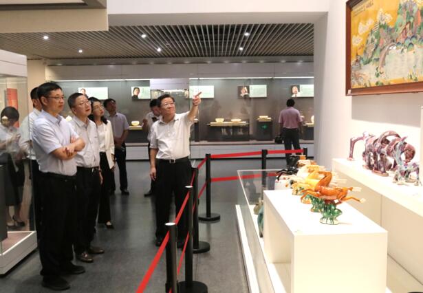 在陶瓷展厅,工作人员介绍了馆藏作品的产地和特色以及五大名窑瓷器的辉煌历史和恢复创新,如龙泉瓷器的哥弟结合、钧窑的铜系青蓝釉、汝窑的大件器物、定窑的拉坯绝技、官窑的老料烧制等。王乾坤副书记重点介绍了学校师生的作品《三彩理工》、《遐思》、《唐卡药师佛》等。在德化窑展区,来宾们称赞作品造型精美、技艺高超,尤其对《昇平舞》和《温婉如玉》赞不绝口,工作人员详细介绍了两件作品的制作方法,来宾们纷纷拍照留念。