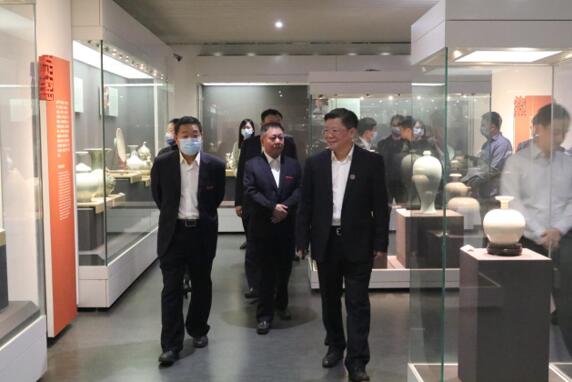 在书画展厅,王乾坤副书记重点介绍了画作《大河之源》《月涌大江流》《山梅飘香》《红丹醉春》以及馆藏李尔重、王瑕举等的书法作品,包括它们的创作背景、创作技巧,以及背后的轶事趣闻。在陶瓷展厅,王乾坤副书记分别介绍了馆藏五大名窑和三大瓷都作品的艺术特征和代表性制瓷大师,重点介绍了师生作品《三彩理工》《钧变万花筒》《武汉理工赋》等。在红船文化展区,高维义书记介绍了韩鸣华先生和童人杰先生的红船艺术作品,并重点介绍我校原交通学院师生手工复刻红船模型,以实际行动致敬建党百年的党史学习教育实践经历。