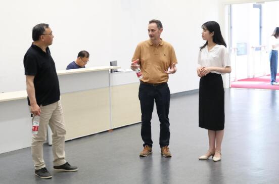 在书画展厅,S. Lanceros Mendez教授对董继宁先生的《大河之源》表现出浓厚的兴趣,提到这幅画让他想到了西班牙的毕尔包古根汉美术馆(GUGGENHEIM,BILBAO),还专门拿出手机跟大家介绍那个建筑。张奇教授谈到,“我走到任何一个地方,都会第一时间参观当地的博物馆。”张奇教授在得知藏在高校里的艺术馆走出深闺,借着自身资源优势,为周边中小学及社区进行美育辐射时,对学校文化阵地的运营模式表示了高度赞扬。