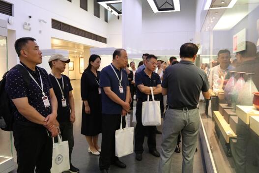 在陶瓷艺术展厅,高维义书记又向来宾们介绍了馆藏五大名窑、三大瓷都的布局主线,以及各窑口的恢复状况和创新现状。在展厅内,程明生先生的瓷玉浮雕《如意观音》吸引了来宾的注意,高维义书记介绍,“在日常光下呈现是素白,与一般浮雕相差无几,若是打开藏品背光,瓷板透光后晶莹剔透,观音的面部表情会出现变化,呈现出晶莹剔透、温润如玉的质感。”来宾们纷纷拿出手机拍照,表示作品的细腻与美感令人叹为观止。