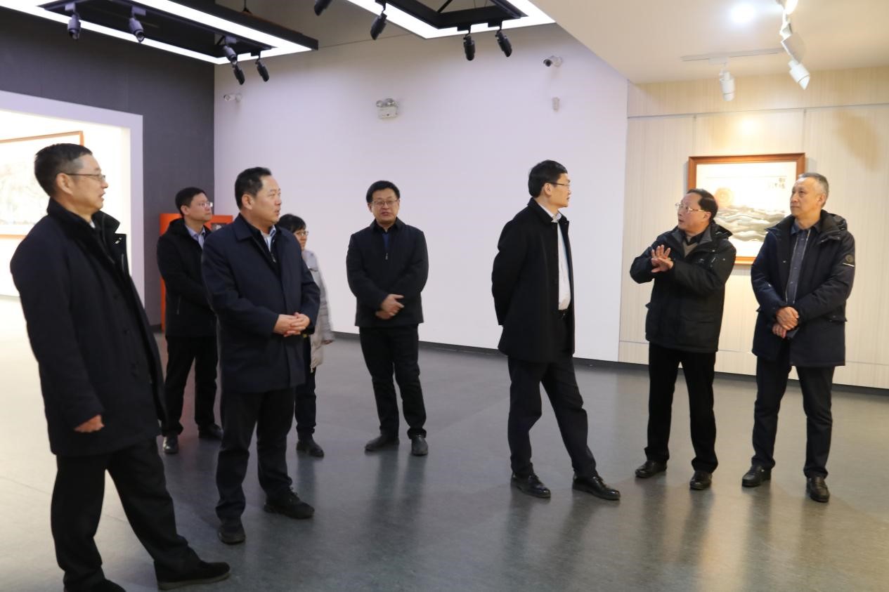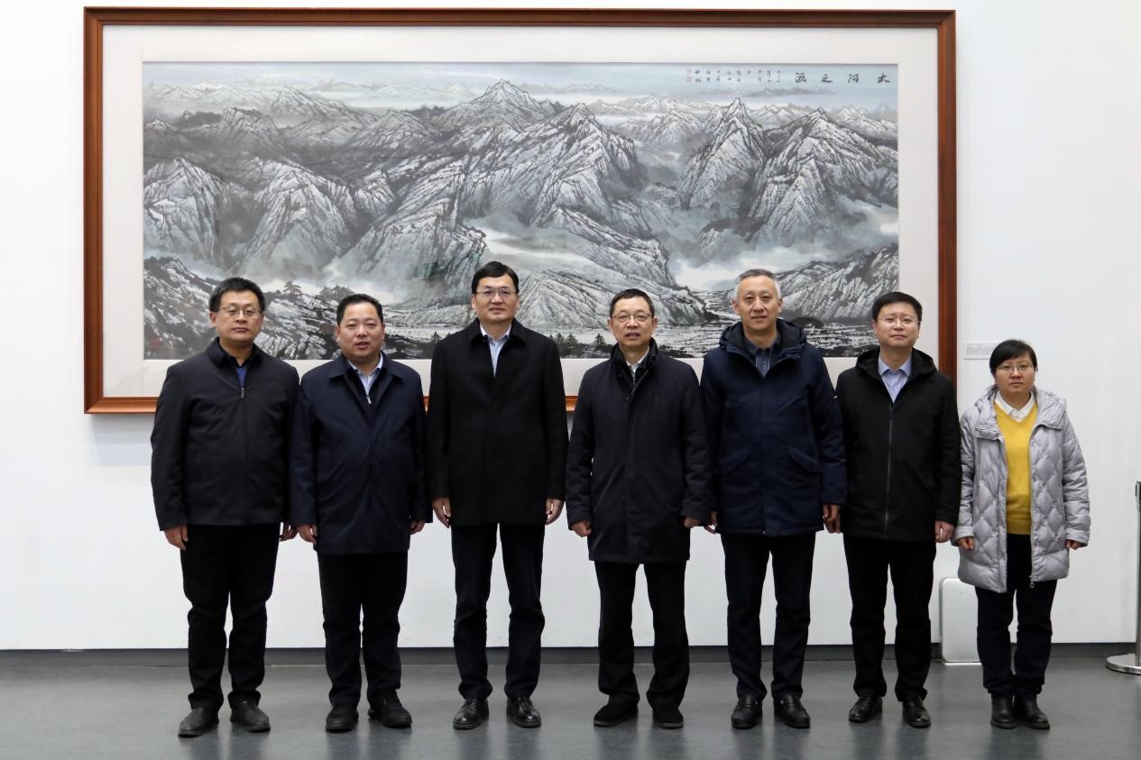 在汗青艺术馆,高维义书记向来宾们重点介绍了馆藏代表性藏品的由来,例如吴冠中油画《梨花吟》、白雪石水墨画《漓江春雨》等,其中有陈汗青教授与恩师吴冠中浓浓的师生情谊,也有我校前辈们为一流学科建设砥砺奋斗的峥嵘记忆。杨宗凯校长介绍了我校艺术与设计学院学科建设历程。张新亮校长一行嘉宾对我校作为理工科综合院校艺术类学科取得的突出建设成果表示了充分肯定。