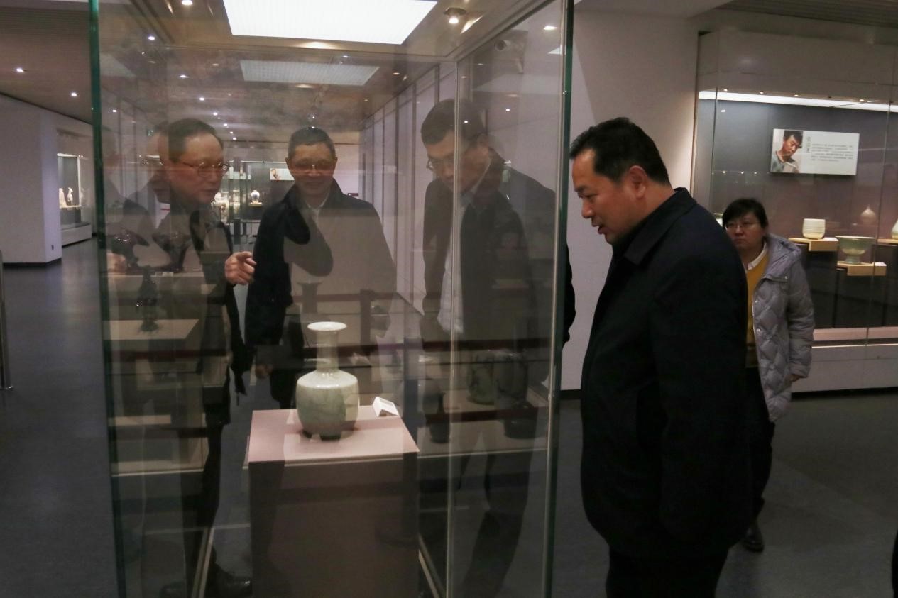 来宾们对展出陶瓷藏品喜爱有加,边赏边交流、边赏边畅谈大学文化育人新模式、课程思政新实践。杨宗凯校长、孟芳兵副书记如数家珍,向来宾们亲自介绍五大名窑、三大瓷都的众多大师级藏品的由来以及背后的轶闻趣事。在景德镇展区,孟芳兵副书记结合亲身经历,讲述了亲眼目睹陶瓷作品高温烧制的奇妙色变的过程,以及馆藏《孔子讲学图》《料胎珐琅彩四件套》等藏品的征集趣事。杨宗凯校长表示艺术人文熏陶是本科教育中非课堂式教学的一个重要环节,学校建设了三维仿真交互展示的数字藏品、线上艺术展厅等,可供师生远程欣赏、把玩,有效扩大了校园艺术人文服务范围和服务实效。来宾们被精湛而丰富的藏品所吸引,被娓娓道来的藏品故事所打动,对我校在文化建设方面的成效给予了较高评价。