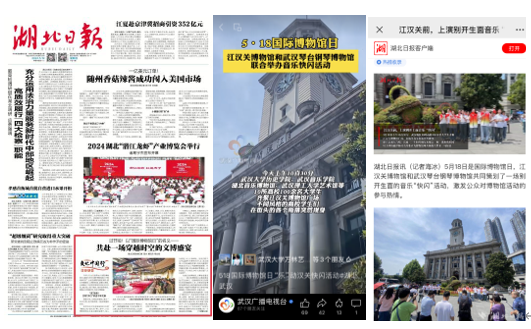 此次音乐快闪活动既展现了我校艺术馆大学生志愿讲解队的青春风貌,又彰显了博物馆深厚的历史底蕴、江城文化的活力与创新。志愿讲解队队员阙湘瑾激动地表示,“通过这场别开生面的音乐快闪活动,不仅让我们体会到了不同博物馆之间文化的碰撞,也为我们搭建了一个与其他高校博物馆志愿者交流借鉴的平台,非常有意义!”活动现场,路人纷纷驻足聆听,共同感受音乐的魅力,该活动被人民日报、湖北日报等媒体广泛报道。