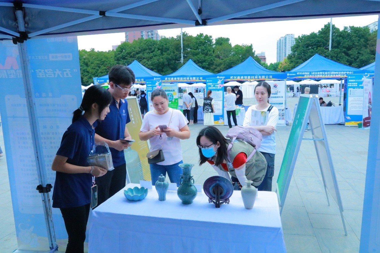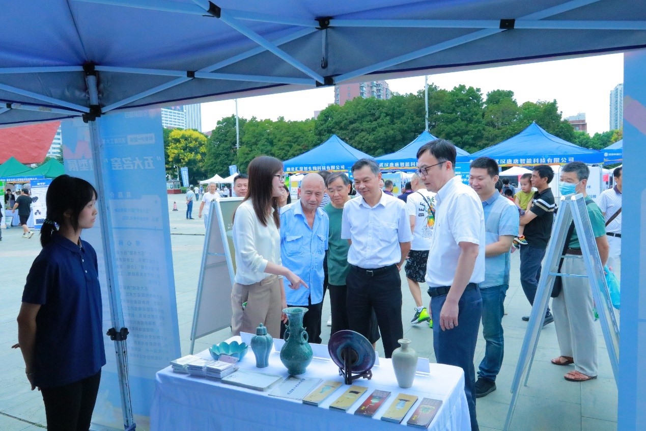 无人机展示、美丽的地质奇石、精美的陶瓷展示、有趣的科普游戏层出不穷,参与市民络绎不绝。活动期间,武汉市科协副主席张若光、武汉市科协副主席袁艳斌等领导来到我校艺术馆科普展台现场,与艺术馆志愿者亲切交流,详细询问本次展览的科普内容、活动进展情况,对我校及众多科普基地联合打造科普大餐给予充分肯定。