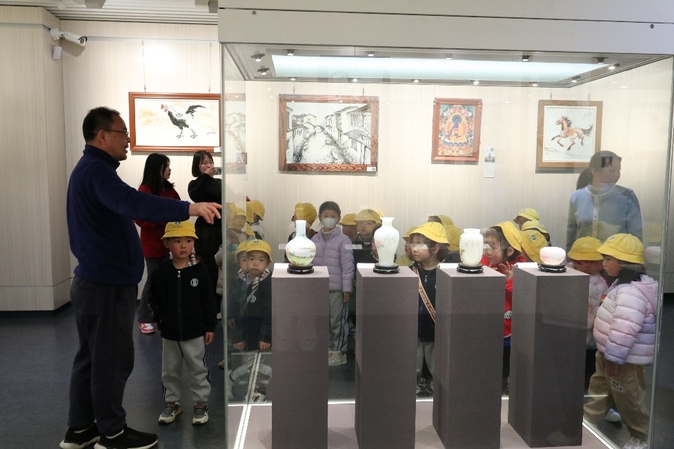 一进入艺术馆,琳琅满目的展品瞬间抓住了孩子们的目光。“老师快看,这个小碗会透光!”当通体似玉的料胎画珐琅彩映入孩子们的眼帘时,随着小朋友清脆的童声,几十双眼睛齐刷刷贴近展柜。讲解老师循循善诱,引导孩子们观察红彩装饰、描金技法的差异,流动的光影在釉彩间折射出绚丽的虹彩,孩子们不约而同发出“哇”的惊叹。行至“孔子讲学图”瓷板画前,孩子们安静下来,认真聆听老师讲述孔夫子与弟子们围坐在树下讲学的场景,齐声跟随老师诵读“知之者不如好之者”,稚嫩童声在展厅回响,仿佛与先贤对话。