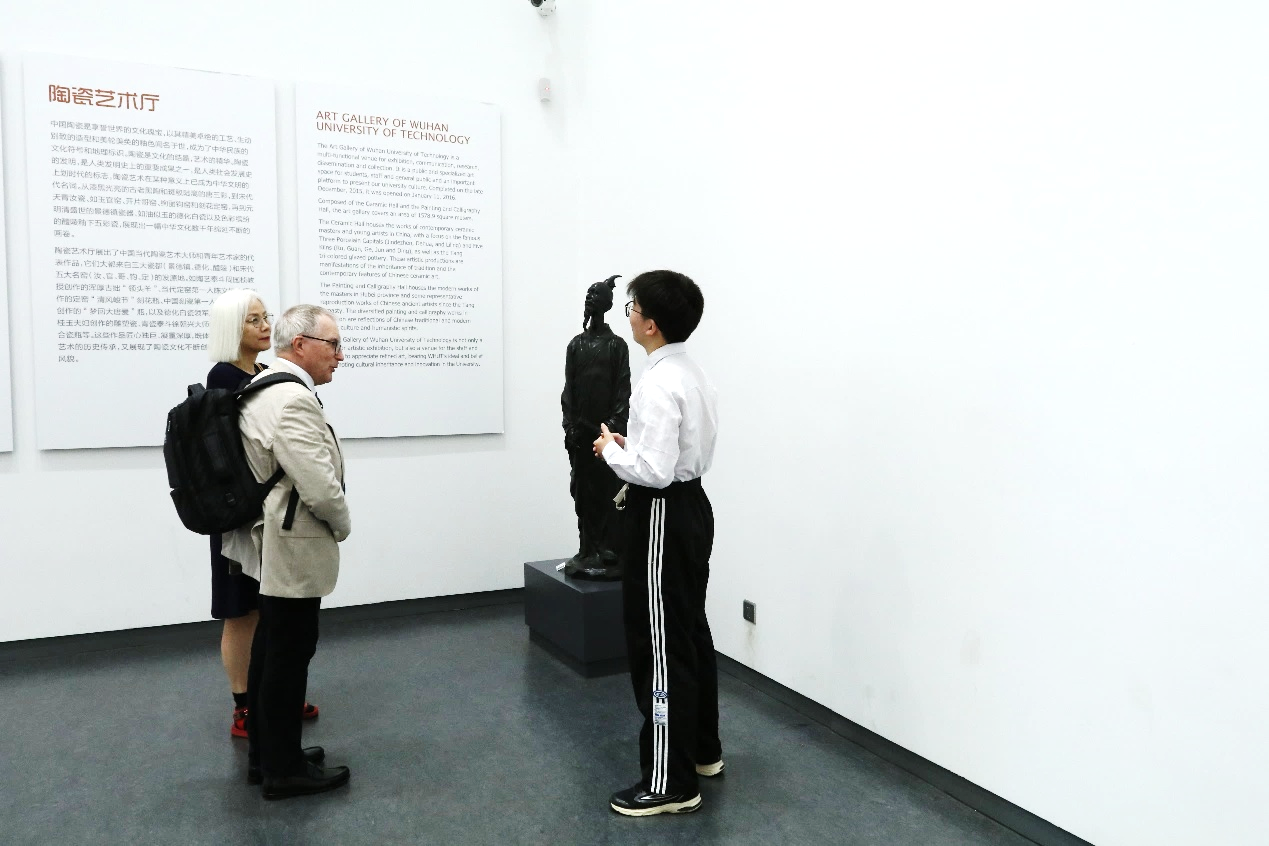 或聆听讲解员解说,或手机扫码使用自助讲解服务,远道而来的宾客们逐一欣赏了馆藏作品。来宾们对“中华传统文化”相关的展品表现出了浓厚的兴趣。一踏入艺术馆的序厅,来自法国海外科学院的来宾被《屈原——问天》雕塑所吸引。该雕塑以现代艺术手法重新诠释了屈原仰天长问的文人身影,生动地展现出屈原仰望星空、叩问宇宙的宏大场景,充满了哲学思考与浪漫情怀。来宾们对屈原有所了解,讲解员趁机向他们介绍了爱国诗人屈原的事迹和精神,来宾们听后纷纷表示赞叹,认为这座雕塑既古典又现代,并对即将到来的中国传统文化节日“端午节”表示非常期待。