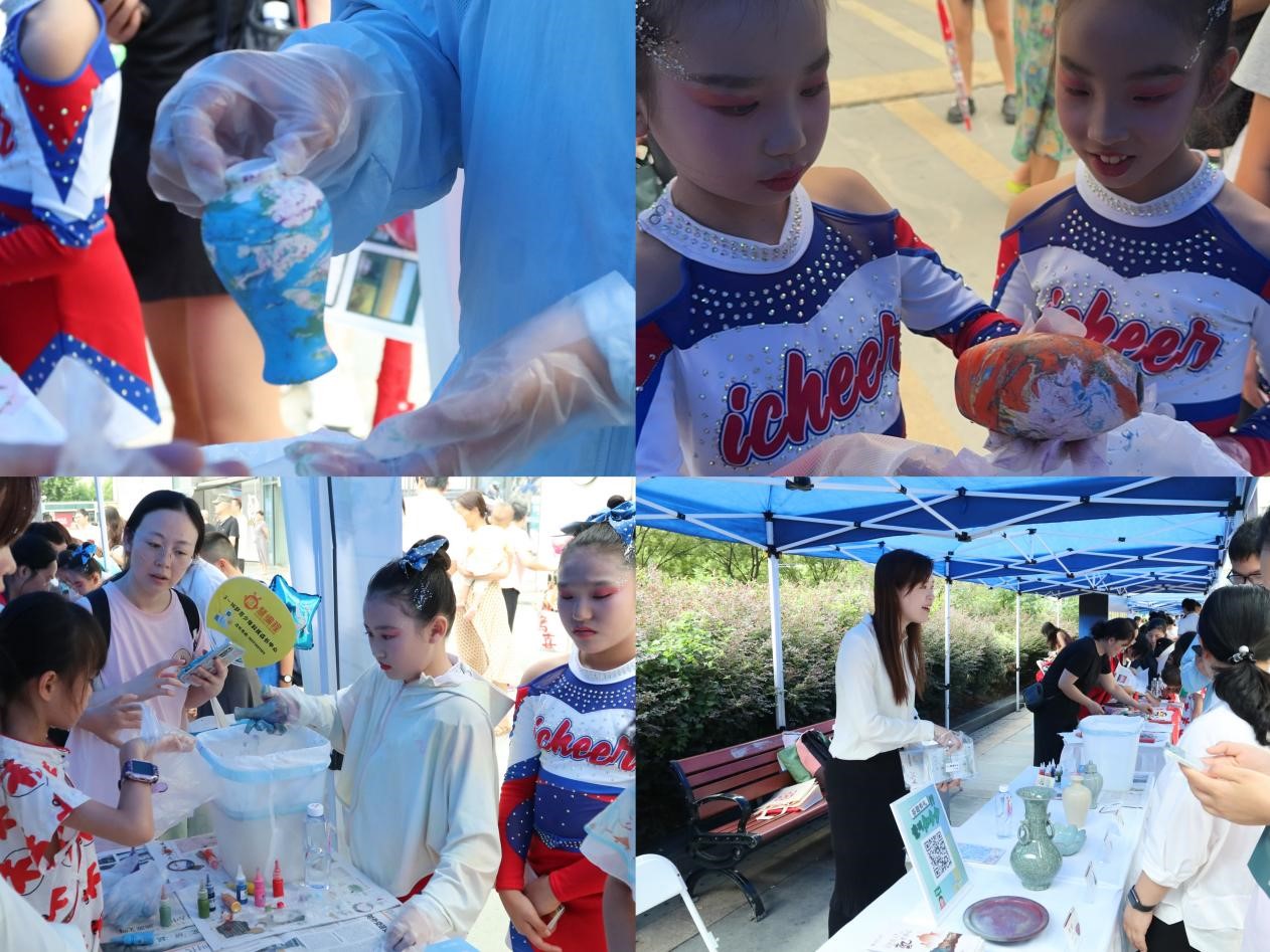 仪式现场,我校艺术馆的科普展台成为最具国潮气质的打卡点之一。本次科普展示分三大板块同步进行。珍品区内,汝、官、哥、钧、定等藏品依次排开,我校科普志愿者依次向观众讲解“五大名窑”机理,短短半小时吸引众多市民驻足围观。互动答题区推出“瓷问知多少”环节,参与市民随机抽取8道陶瓷科学与艺术常识,答对5题即可领取我校艺术馆文创产品,150份文创产品迅速发放一空。非遗体验环节最受亲子家庭青睐,家长与孩子通过飘漆、旋转、吹气等方式协作完成“抽象瓷”,现场“翻车”与惊喜并存,沉浸式感受科学与艺术交融的魅力。